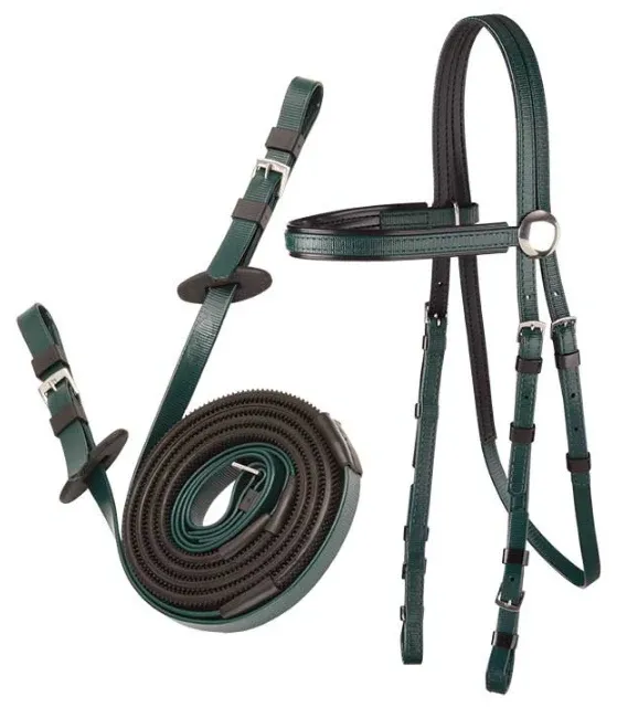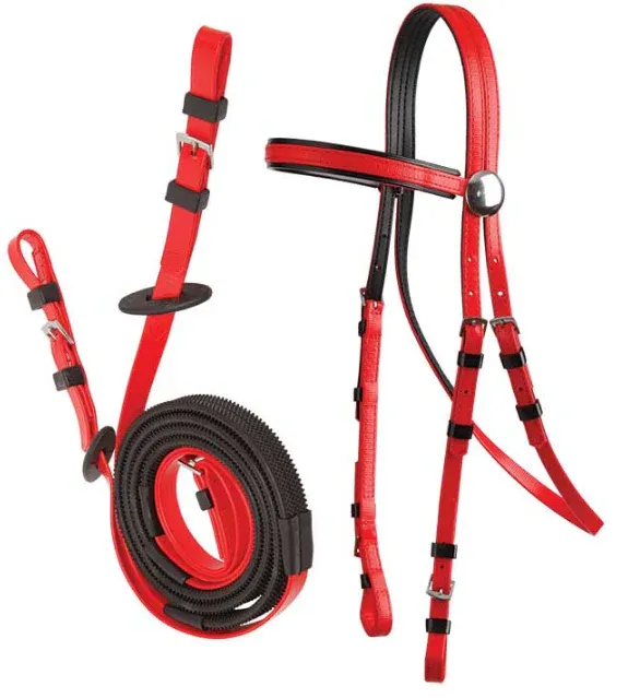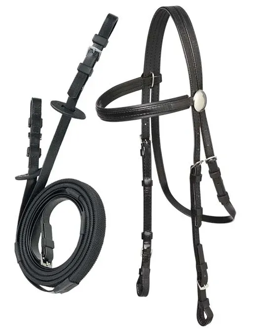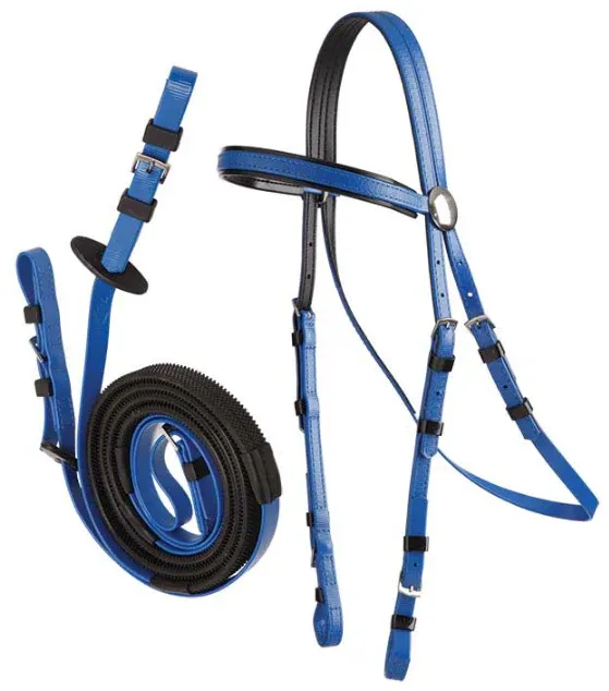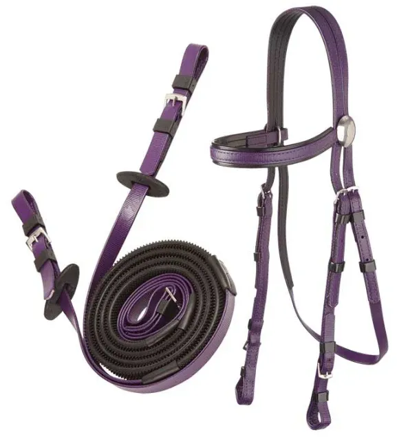 Rênes 16 mm de large avec porte-mors à boucles. Mains caoutchouc à petits picots de 61 cm de long. Longueur totale des rênes: 145 cm.