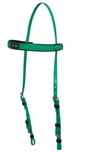 Le Bridon d’Endurance Deluxe est un modèle en deux parties, permettant de détacher rapidement le frontal et les montants (partie bridon) tout en laissant la partie licol en place. Il suffit pour cela de libérer les mousquetons du frontal. Tous les accessoires sont en acier inoxydable.