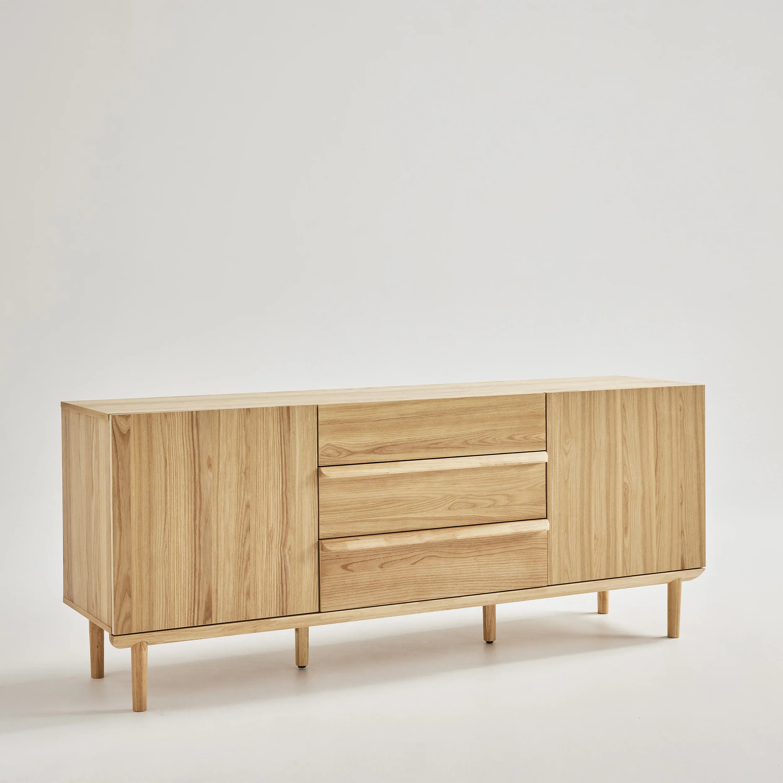 Ah, Bergen ! Si on avait un super-héros du mobilier, ce serait lui. Ce buffet à 2 portes et 3 tiroirs en bois tout droit venu de chez Drawer, c’est un peu comme si la fonctionnalité rencontrait le design pour créer quelque chose d’unique. Et quand on dit bois, on parle d’un assemblage raffiné de MDF et de placage chêne, avec des touches finales en bois massif d’hévéa pour les poignées et le piétement.