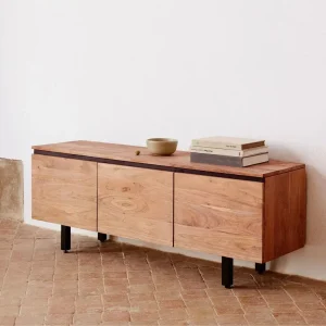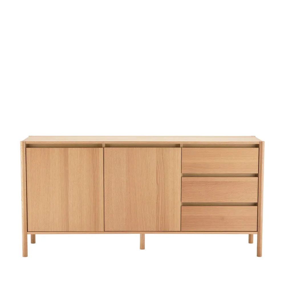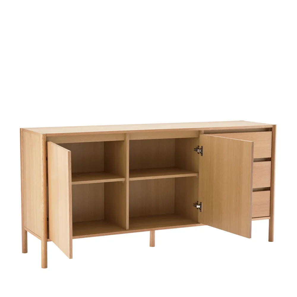 Fabriqué à partir de bois massif, de panneaux de particules et d’un placage en chêne clair, Verade combine robustesse et élégance. Les deux portes soft close apportent une vraie dose de praticité en dissimulant soigneusement votre vaisselle ou vos dossiers, tandis que les trois tiroirs offrent une solution idéale pour les petits objets du quotidien qui ne demandent qu’à rester accessibles.