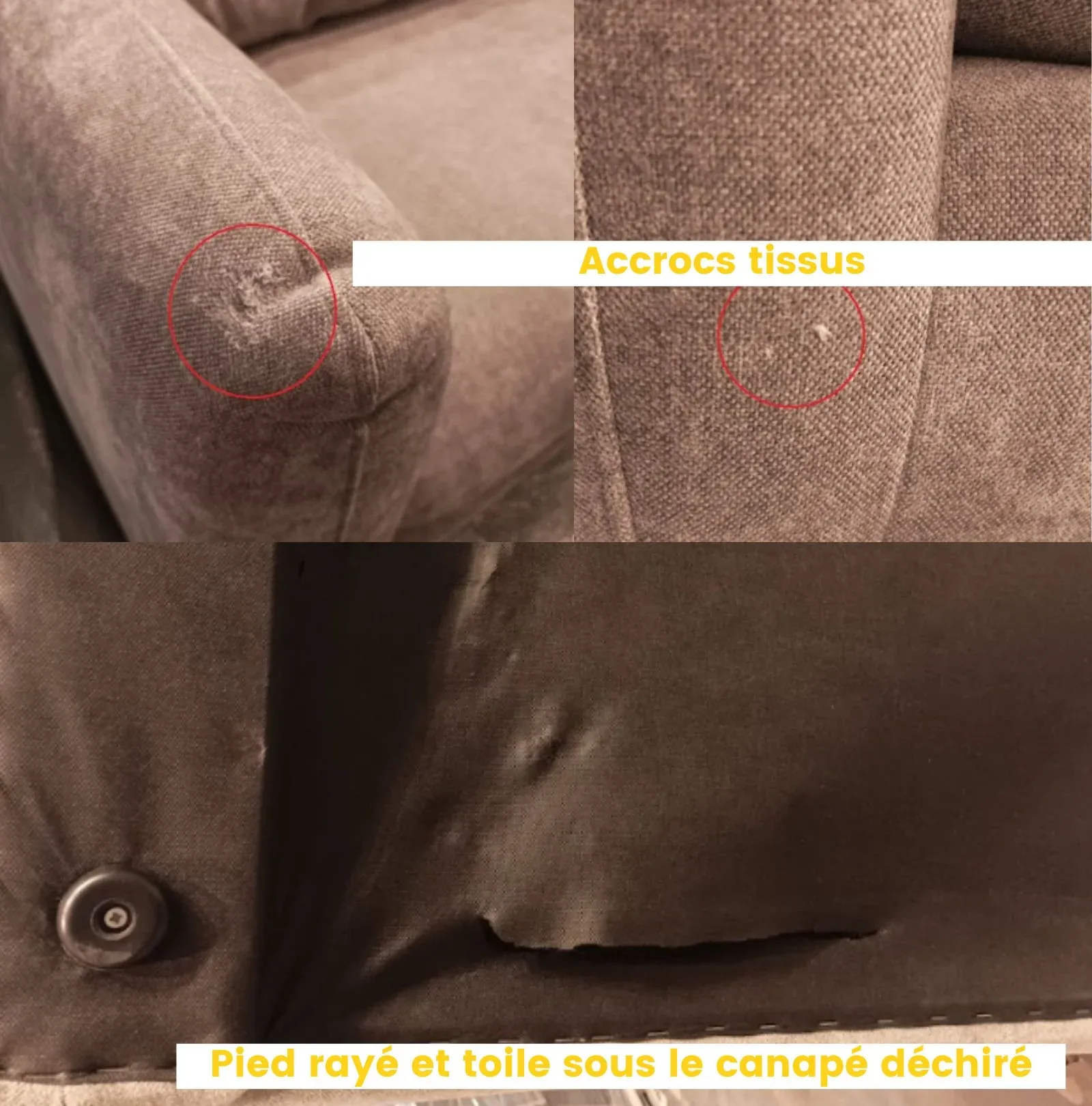 - Défauts: 2 accrocs sur le tissu, pied frotté et toile du dessous craquée (voir photos)