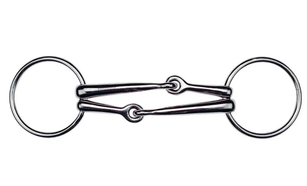 En inox à double embouchure, recommandé pour les chevaux à bouche dure mais ne « tirant » pas. La brisure asymétrique a un bon effet décontractant.