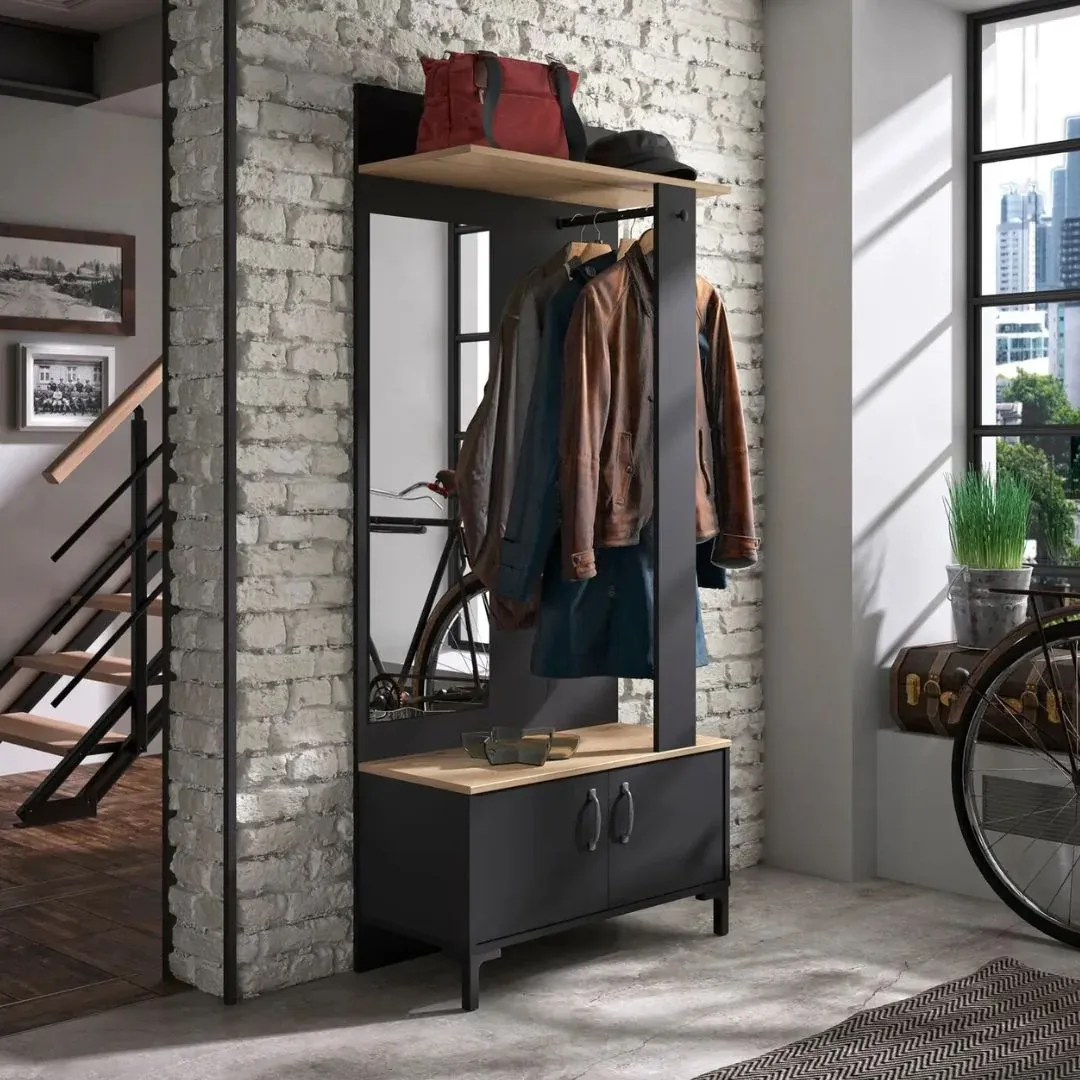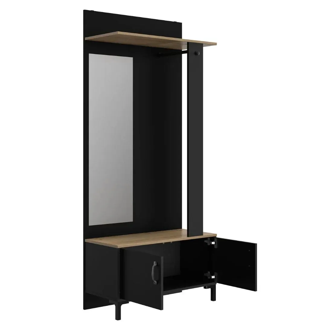Il comporte une tablette en haut, une penderie, une petite patère, un grand miroir et un espace de rangement fermé derrière les 2 portes battantes : idéal pour ranger les chaussures.
