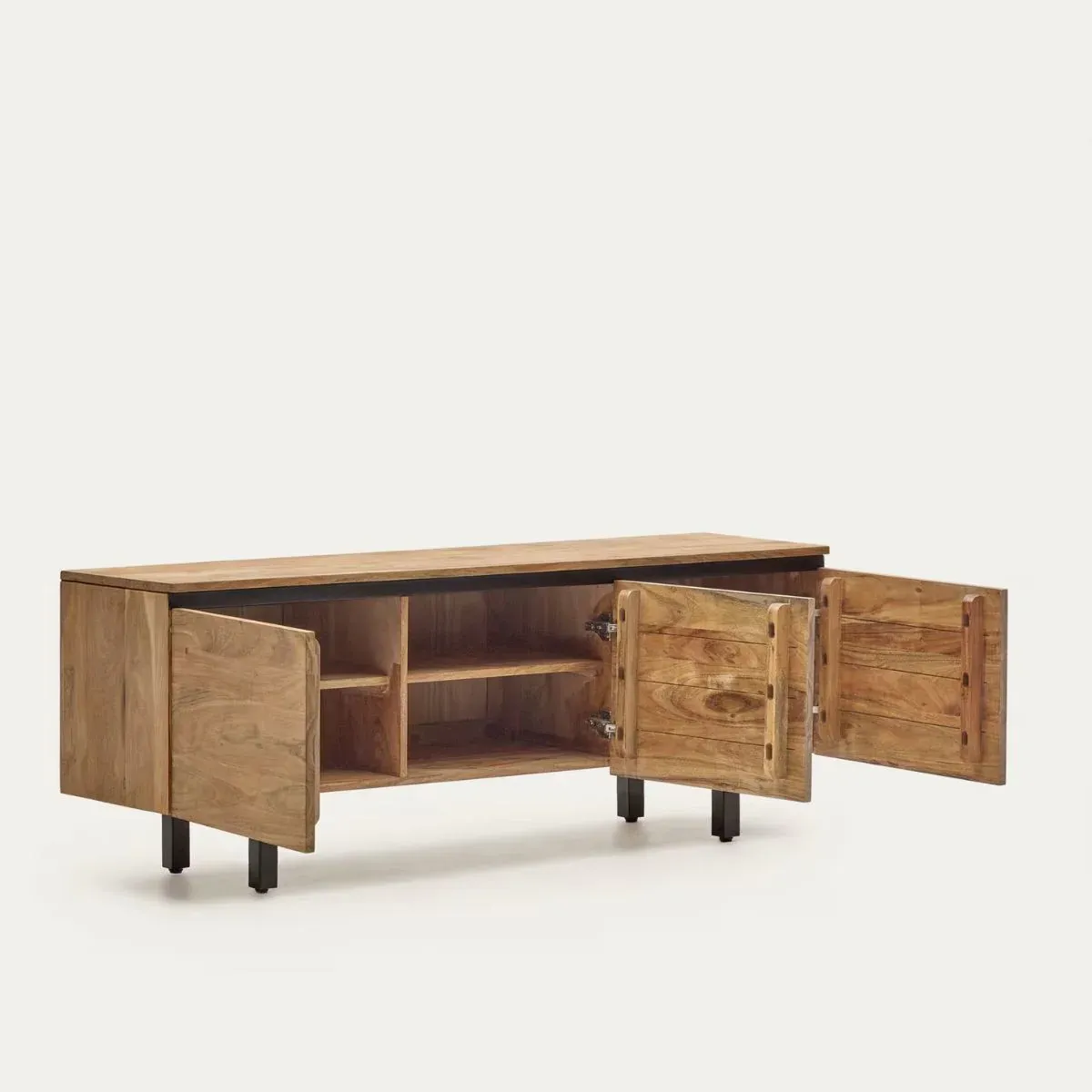 La collection Uxue en bois d’acacia est une création de l’équipe Kave Home. Elle se distingue par la ligne noire qui traverse chaque meuble. Chaque pièce est exclusive grâce aux veinures et aux tonalités uniques caractéristiques du bois.