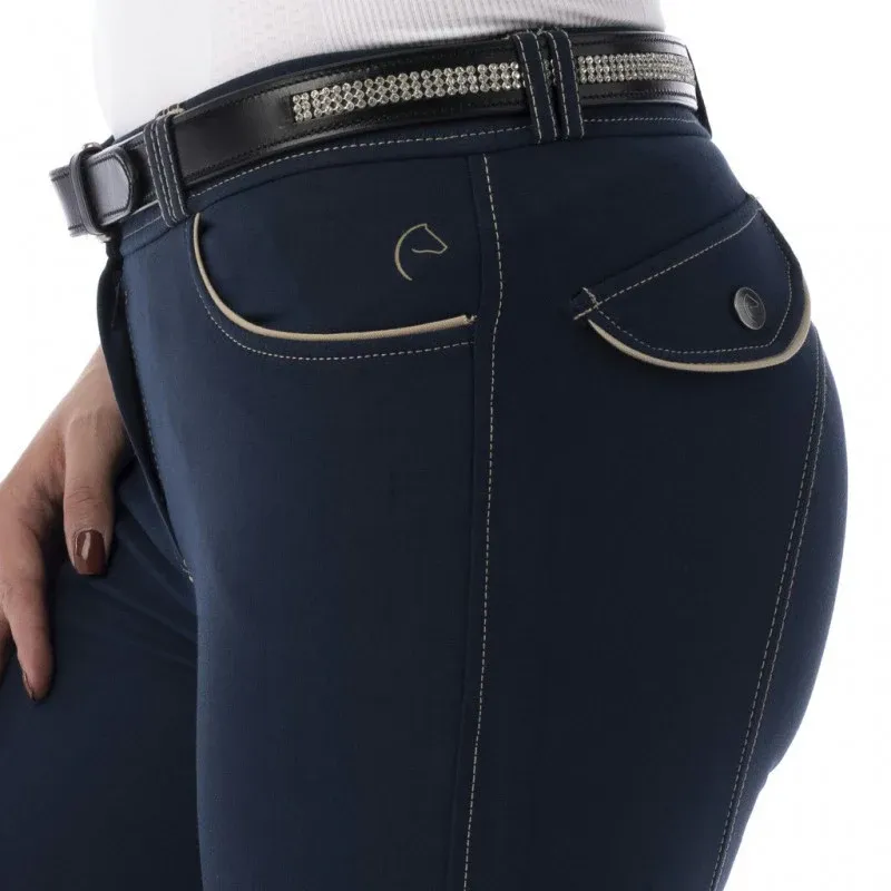 Surpiqûres en coloris contrasté, galbant la jambe et soulignant le fond découpé et les basanes tissu. Equipée de poches cavalières à l’avant et de fausses poches pressionnées à l’arrière, toutes décorées de passepoils en coloris contrasté.