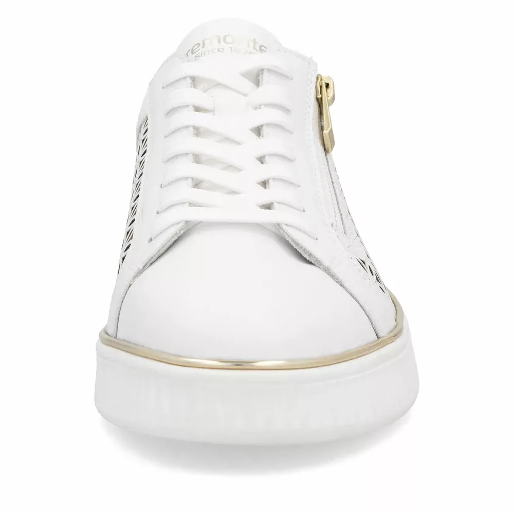 Élégante et moderne, la basket femme D2E03-80 combine un confort et une touche brillante. Sa semelle épaisse assure un confort optimal tout en offrant un excellent maintien. Les personnes qui portent des semelles orthopédiques seront enchantées par ces baskets blanches avec semelles amovibles de la marque Remonte ! Par souci pratique ce modèle intègre à la fois un laçage à l’avant et une fermeture éclair sur le côté.
