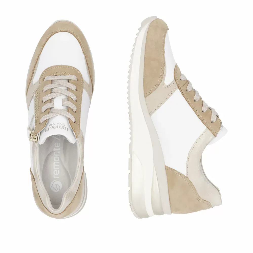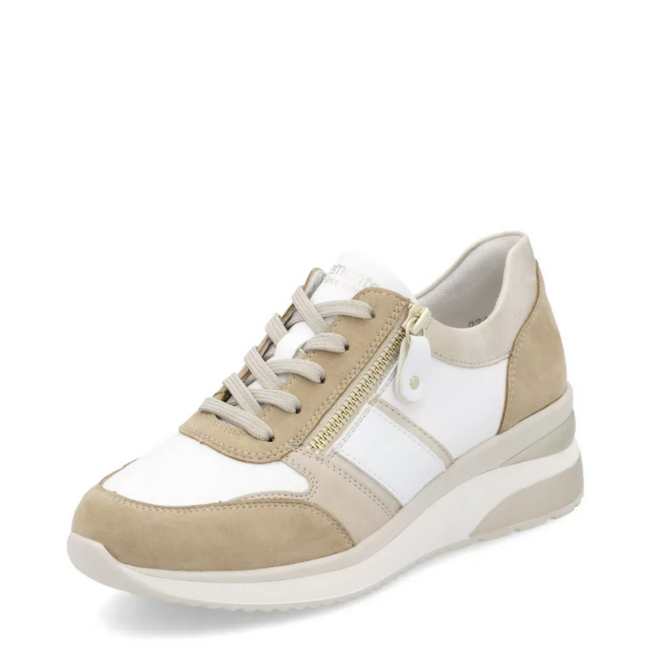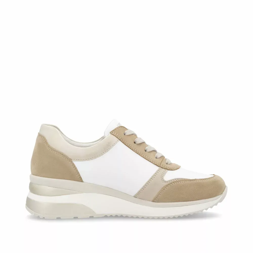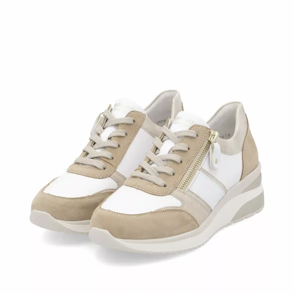Vous ne quitterez plus vos baskets compensées beiges de la marque Remonte ! Parfaitement adaptées aux personnes qui portent des semelles orthopédiques, elles disposent de semelles intérieures amovibles. Par souci pratique ce modèle intègre à la fois un laçage à l’avant et une fermeture éclair sur le côté.