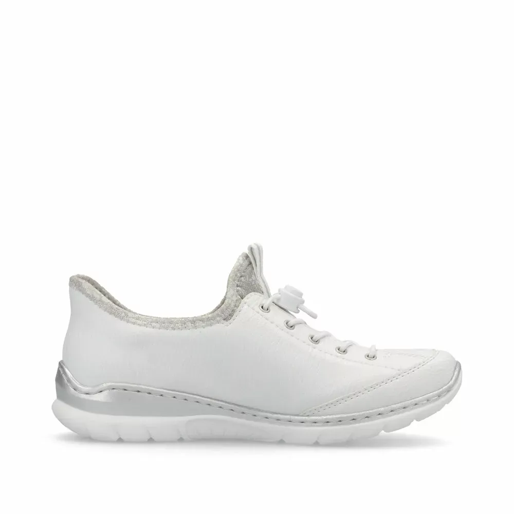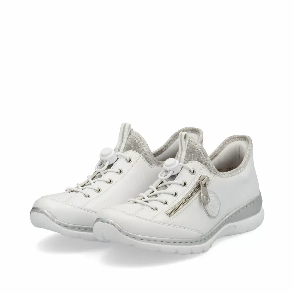 Vous ne quitterez plus les L32F1-80 ces baskets blanches élastiquées pour femme de la marque Rieker très faciles à chausser au quotidien. En effet, elles disposent de lacets élastiqués avec curseur et s’enfilent très facilement comme des chaussettes ! Légères et ultra confortables, elles disposent de semelles intérieures avec mémoire de forme.
