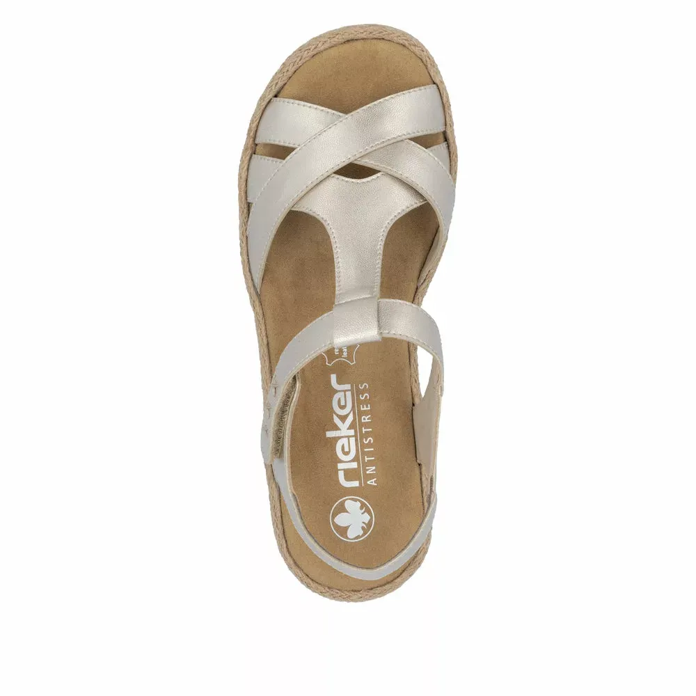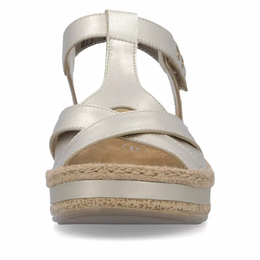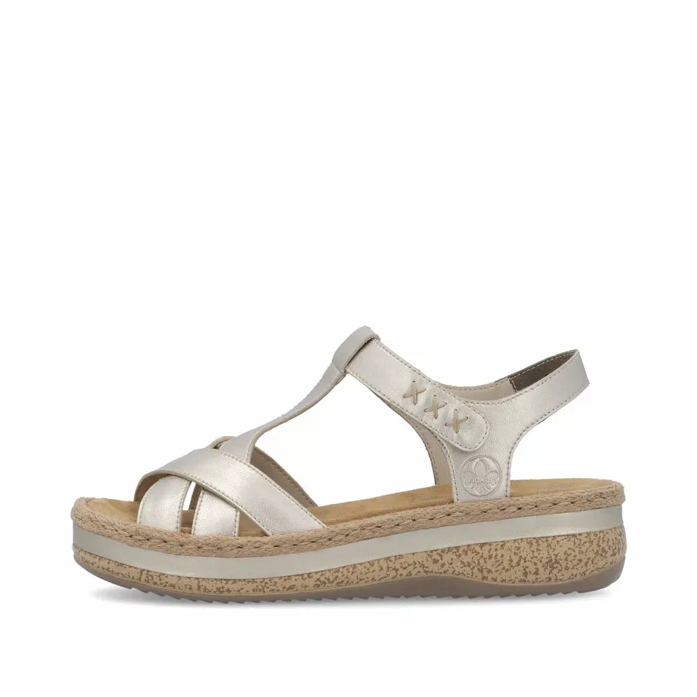 Ces sandales dorées compensées Rieker vous chausseront confortablement. Le bonheur est à vos pieds avec cette sandale grand confort ! Elle vous suivra tout l’été et vous garantit des sorties sans modération … Sa semelle intérieure moelleuse procure une sensation de confort et de douceur. Faciles à porter au quotidien, ces jolies sandales dorées femme se chaussent rapidement grâce à leur velcro.