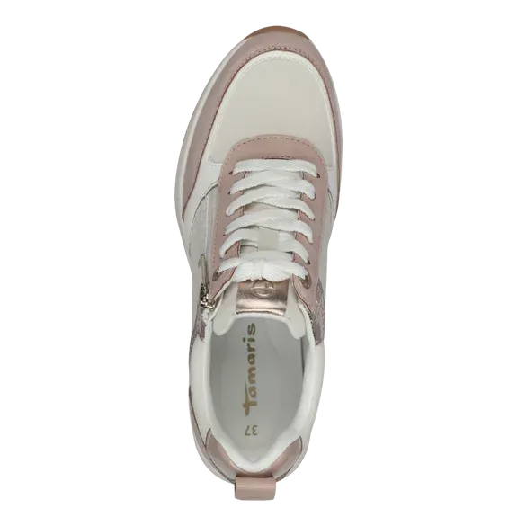 Ces baskets compensées beige et rose vous accompagneront toute la saison. Les personnes qui portent des semelles orthopédiques seront enchantées par ces chaussures avec semelles amovibles de la marque Tamaris ! Par souci pratique ce modèle intègre à la fois un laçage à l’avant et une fermeture éclair sur le côté.