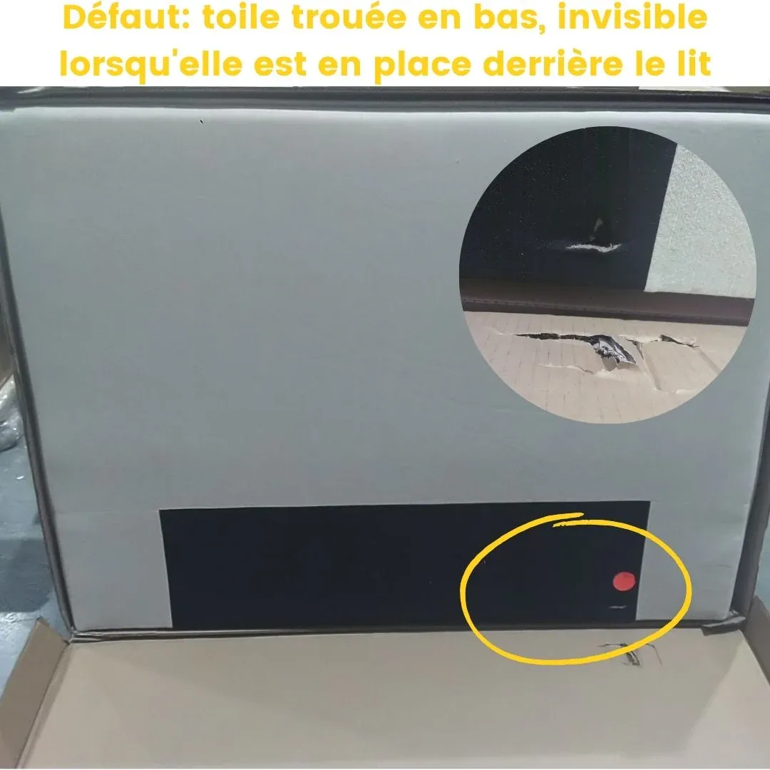 - Défaut: toile trouée en bas, invisible lorsqu’elle est en place derrière le lit (voir photo)