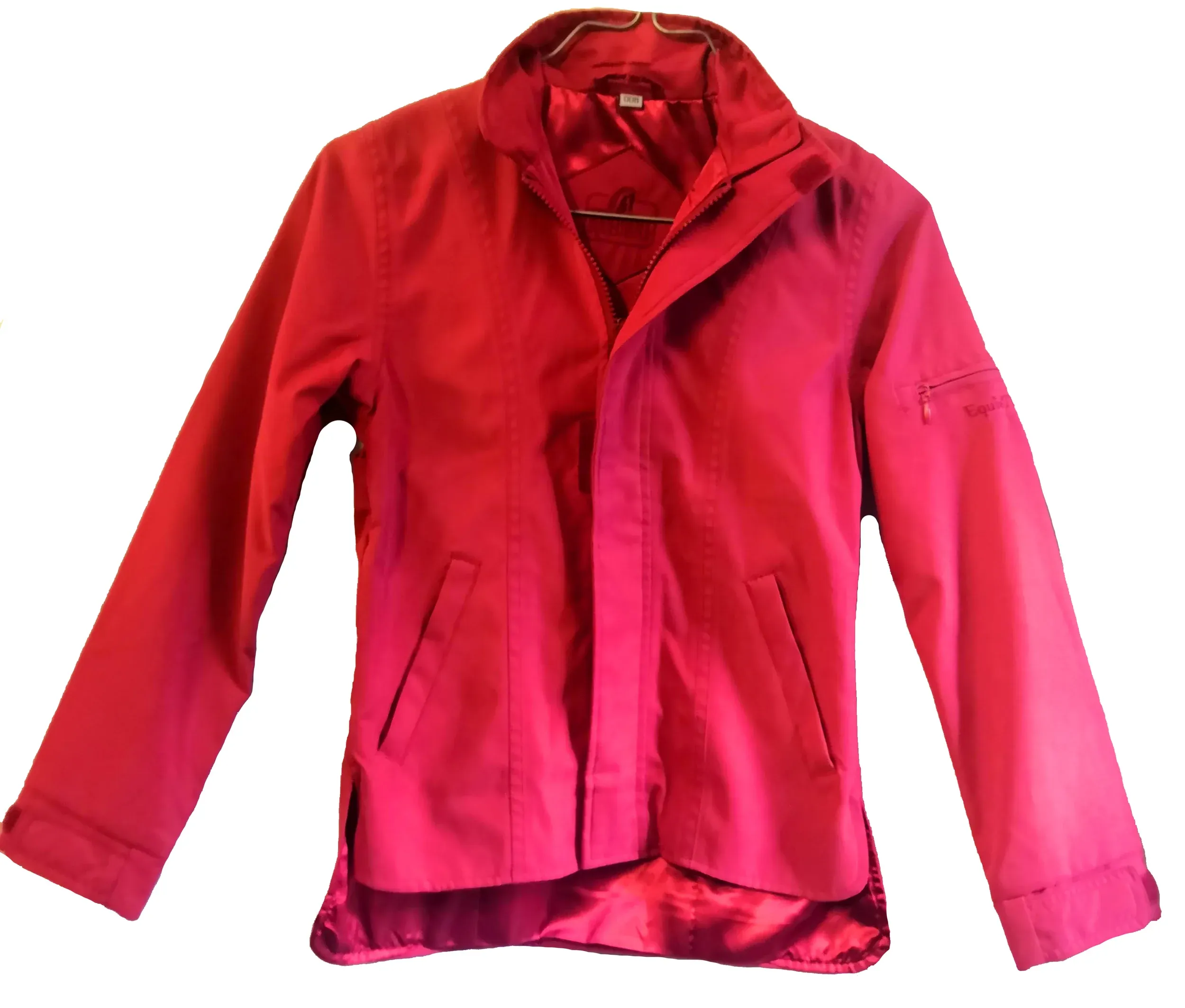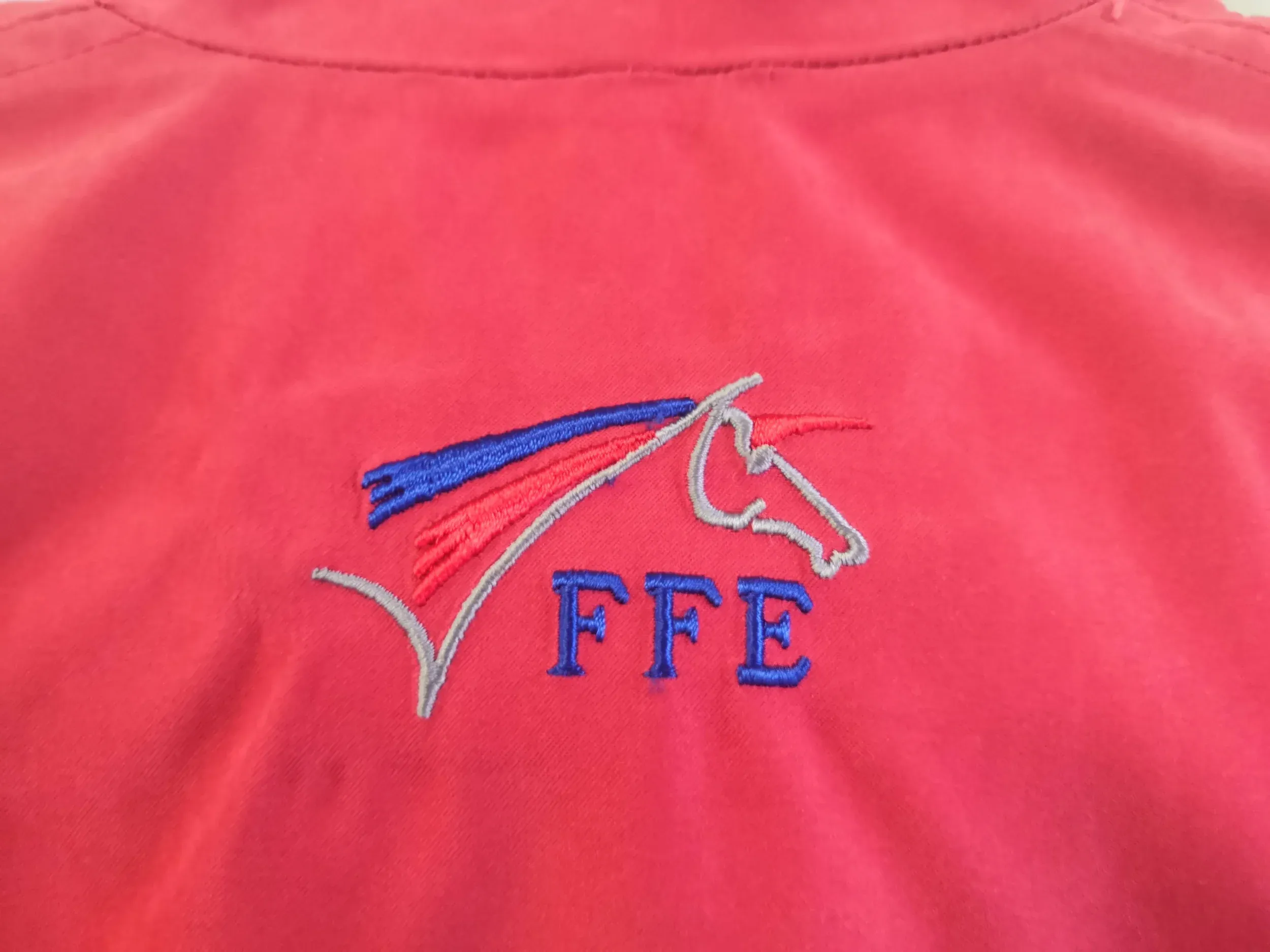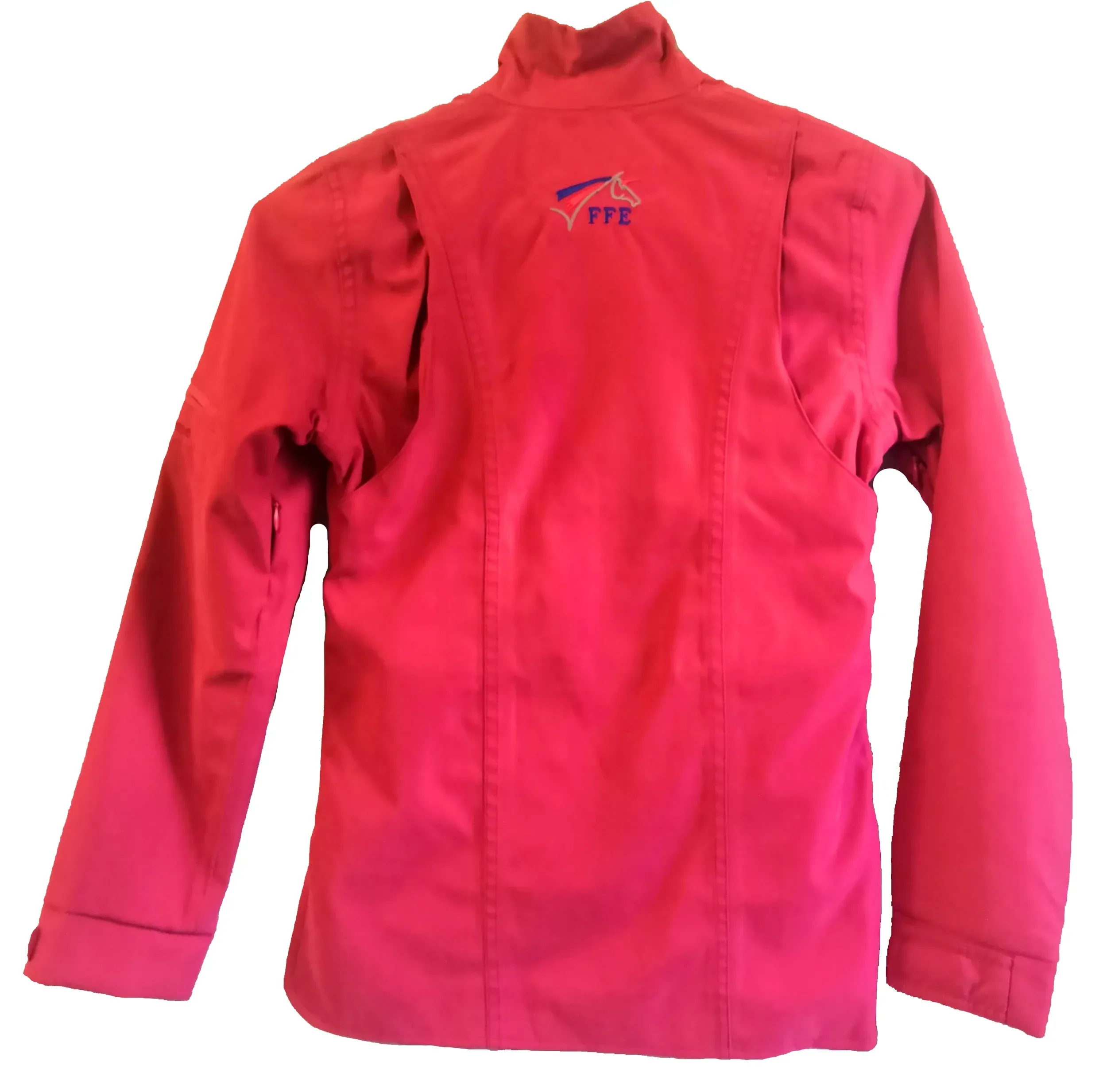 Veste homologuée F.F.E. (Fédération Française d’Equitation) en tissu microfibres 100 % polyester imperméable (> 5000 mm par m2) avec coutures thermosoudées, respirant (>5000 mvp/gm2) et coupe-vent.
